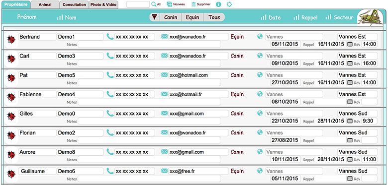 Stockage des données, classement des clients, animaux, lieux, dates, photos, radios…